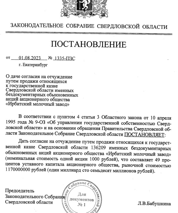 Завершается многолетняя эпопея вокруг продажи легендарного Ирбитского молочного завода, который пока еще полностью принадлежит Свердловской области. Региональные власти после долгих раздумий решили реализовать на конкурсе 49% уставного капитала акционерного общества рыночной стоимостью 1,17 млрд рублей. Соответствующее согласие дали депутаты ЗакСо в начале августа.