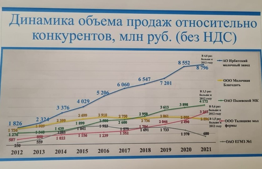 Отметим, Ирбитский молочный завод основан в 1925 году, предприятие занимает более 25% рынка молочной продукции в Свердловской области. В 2022 году при обороте 9,8 млрд руб. АО получило 102 млн руб. чистой прибыли.