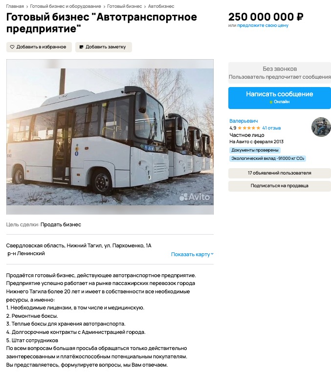В Нижнем Тагиле на продажу выставлено автотранспортное предприятие. В объявлении, размещённом на Avito, говорится, что оно «успешно работает на рынке пассажирских перевозок города более 20 лет и имеет в собственности все необходимые ресурсы». За компанию просят 250 млн рублей. За эту сумму покупатель получает необходимые лицензии, ремонтные боксы, теплые боксы для хранения автотранспорта, долгосрочные контракты с администрацией города и штат сотрудников, указано в объявлении.