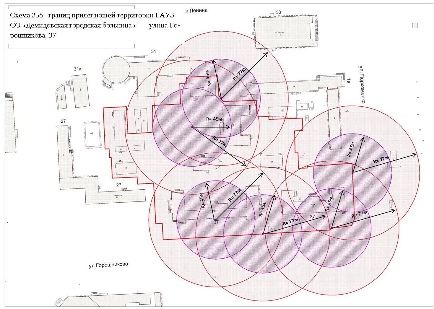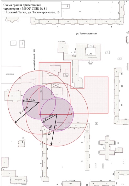 Границы проходят по линиям, равноудаленным от каждого входа в здание. При наличии у объектов, обособленных территорий границы прилегающих территорий проходят по линиям, равноудаленным от каждого входа на обособленные территории. Для примера нормы для школы №81: