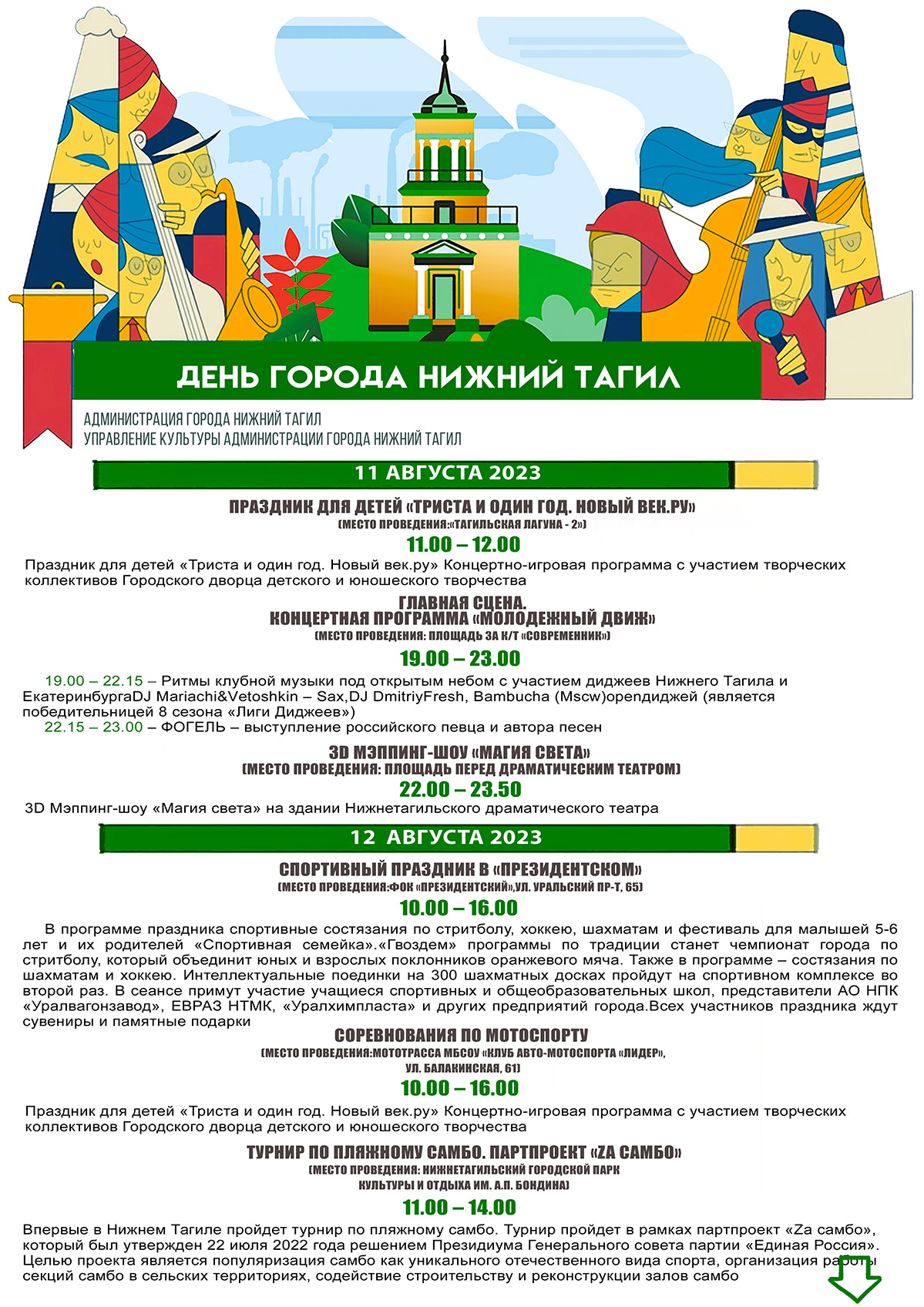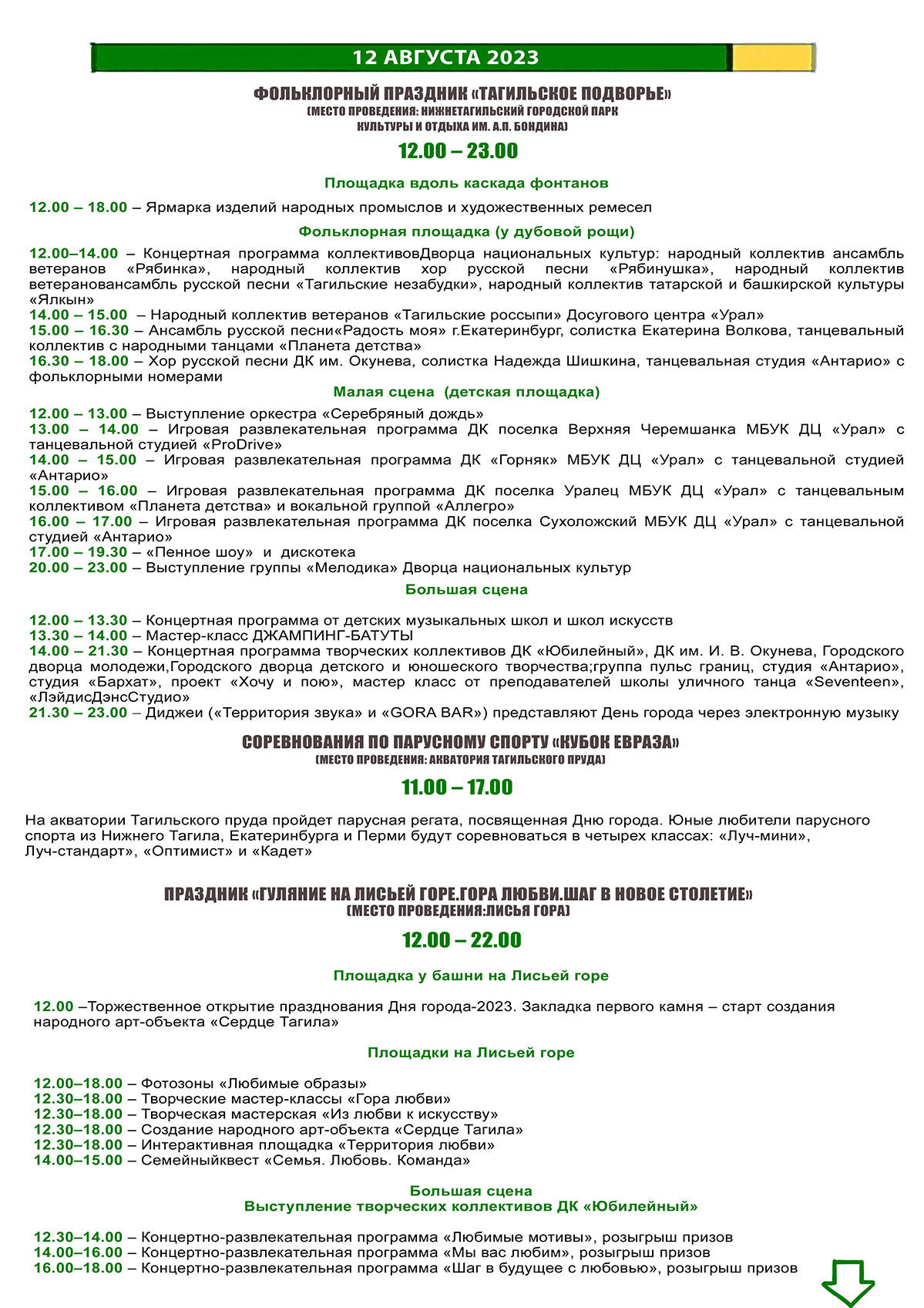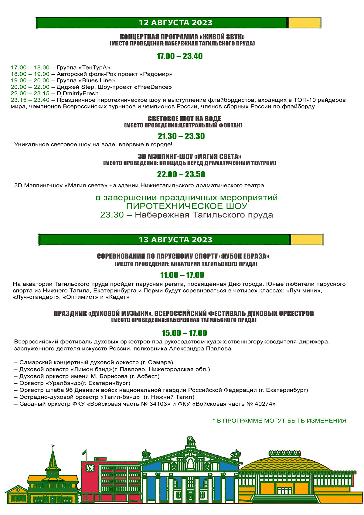 В субботу днём пройдут традиционные гуляния на Лисьей горе, запланировал ряд мероприятий в парке им. Бондина и на набережной. Также на Лисьей горе состоится фестиваль уличного кино (18.00-22.00). Новинкой станет световое шоу на воде у Центрального фонтана (21.30-23.30). На Тагильском пруду выступят флайбордисты (15.00, 18.00 и 23.15). Повторят мэппинг-шоу (22.00-23.50).
