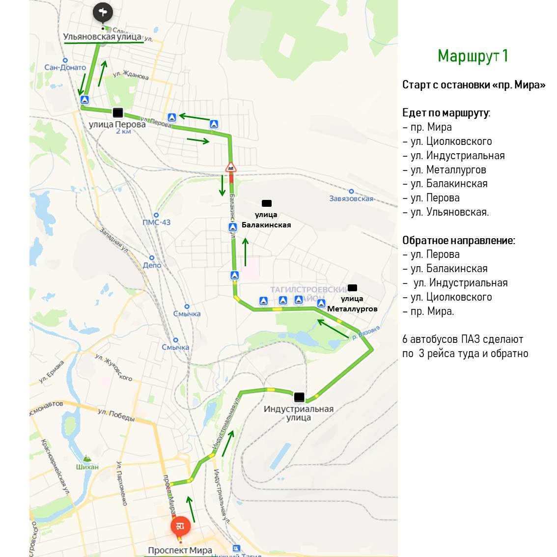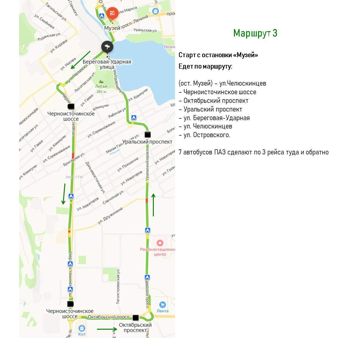 - 1 автобус на ГГМ по маршруту - пр. Ленина – ул. Островского – ул. Челюскинцев – Черноисточинское шоссе – Октябрьский проспект – Уральский проспект – ул. Береговая – Ударная.
