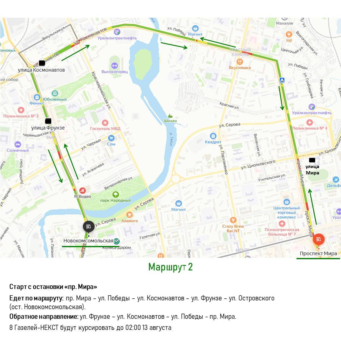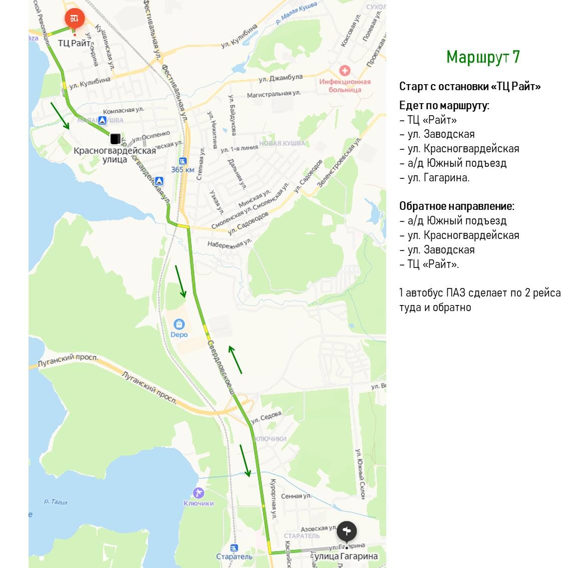 - 1 автобус на ГГМ по маршруту - пр. Ленина – ул. Островского – ул. Челюскинцев – Черноисточинское шоссе – Октябрьский проспект – Уральский проспект – ул. Береговая – Ударная