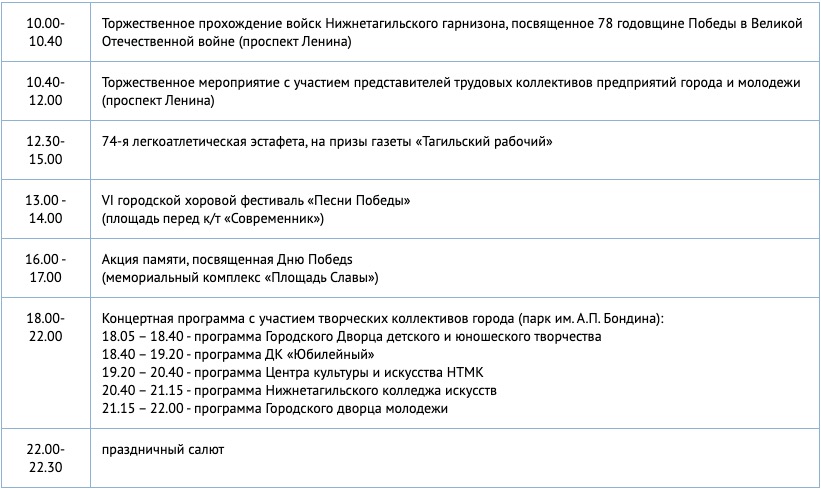 Шествие закончится к 12.00, а в 12.30 стартует 74-я легкоатлетическая эстафета на призы газеты «Тагильский рабочий» . В 16.00 состоится акция памяти, посвященная Дню Победы в Великой Отечественной войне на мемориальном комплексе «Площадь Славы». С 18.00 до 22.00 в парке им. А.П. Бондина пройдет концертная программа.