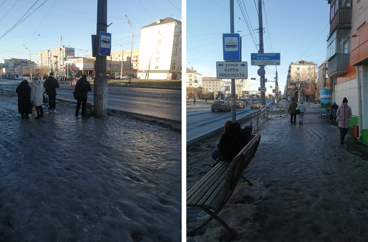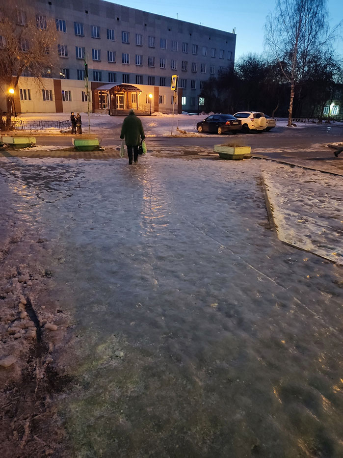 «Улица Фрунзе. Ходить по городу очень скользко, опасно, страшно! Ледовое шоу по-тагильски объявляется открытым... Путь до ближайшей аптеки или магазина все больше напоминает полосу препятствий. И ни одного посыпанного тротуара на улицах не заметила, увы... Жаль, что чиновники у нас пешком по таким тротуарам не ходят. Может быть тогда бы до них хоть что-то дошло», — жалуются женщина в паблике «Инцидент Нижний Тагил».
