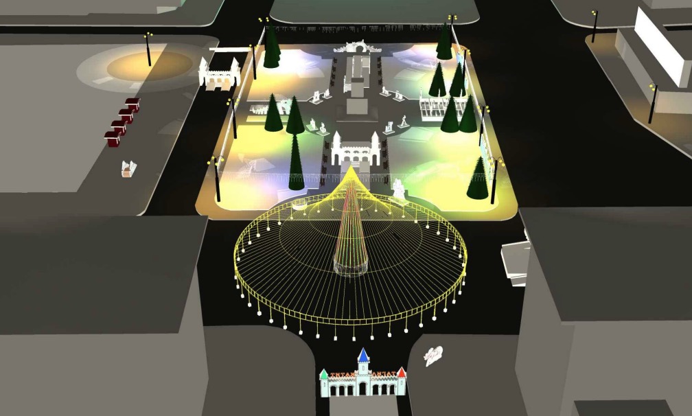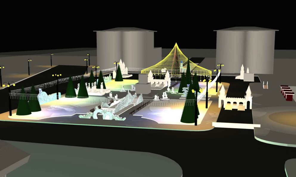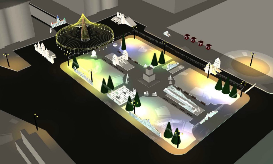 Главным элементом композиции станет искусственная ель со светодиодным шатром высотой 18 метров. Рядом установят фигуры Деда Мороза и Снегурочки, а в центральной части городка расположат тематические скульптуры изо льда.