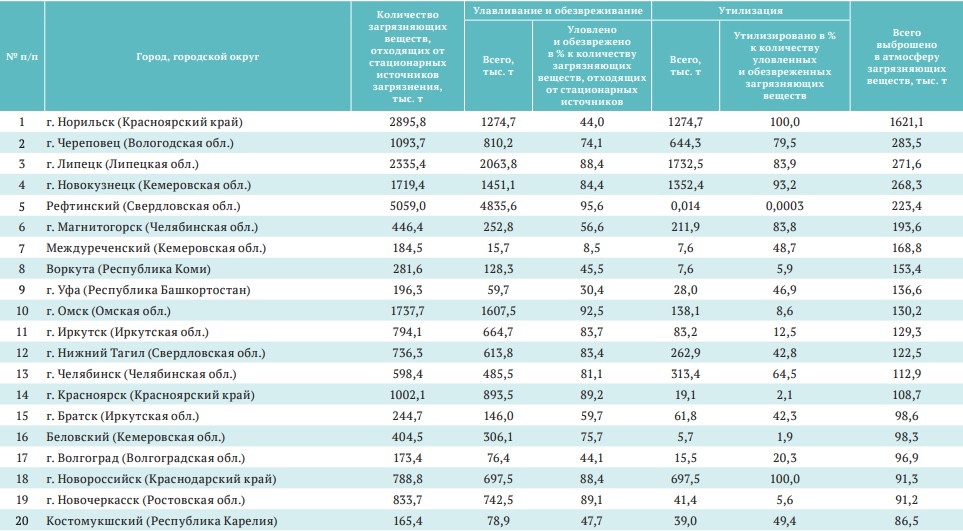 Первое место «черного» списка занял Норильск (1621,1 тыс. тонн), следом идут Череповец (283,5 тыс. тонн) и Липецк (271,6 тыс. тонн).