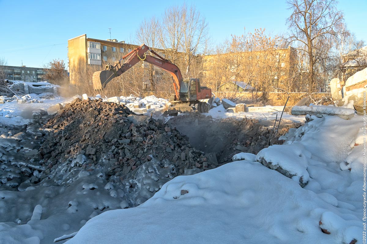Все работы будут завершены до конца мая, сообщил мэр Владислав Пинаев. Весной большегрузы начнут завозить сюда грунт и глину для рекультивации огромных ям, которые остались после сноса.