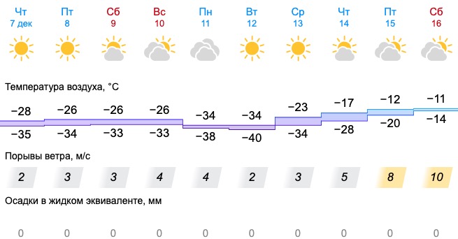 Согласно прогнозу Уральского гидрометцентра, в пятницу, 8 декабря ожидается -26...-31 днём и до -39 ночью. В низинах может быть на пять градусов холоднее. В субботу придёт символическое потепление: днём -24...-29, ночью -29...-34. В воскресенье погода существенно не изменится. Второй пик морозов может прийти в начале следующей недели.