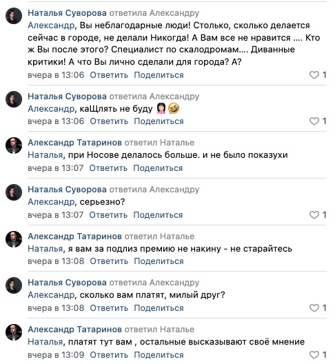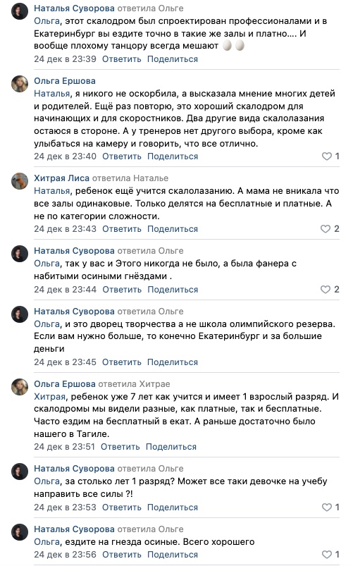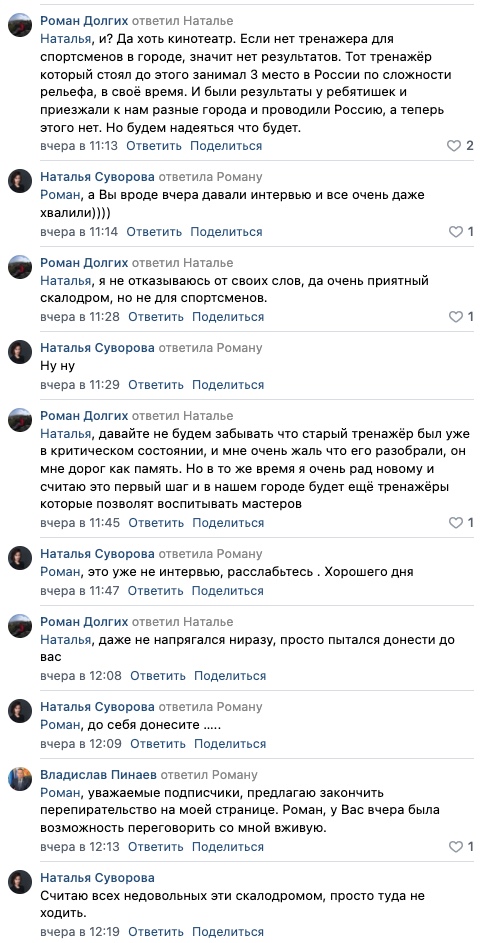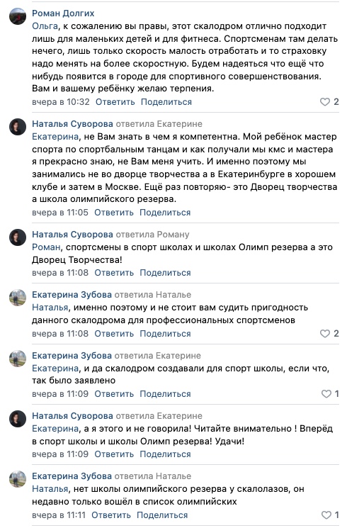 С ней в спор включилась традиционный оппонент всех недовольных Наталья Суворова, чей аккаунт был создан несколько месяцев назад и, по нашим данным, принадлежит пресс-службе администрации (косвенно это подтвердила сама «Наталья», сообщив, что была вместе с мэром во время приёмки). Спор дошёл до того, что «Наталья» посоветовала женщине больше уделять внимания учёбе ребёнка из-за того, что он имеет первый разряд. На защиту молодой мамы встал сотрудник Службы спасения Нижнего Тагила Роман Долгих, который вместе с мэром также участвовал в приёмке скалодрома.