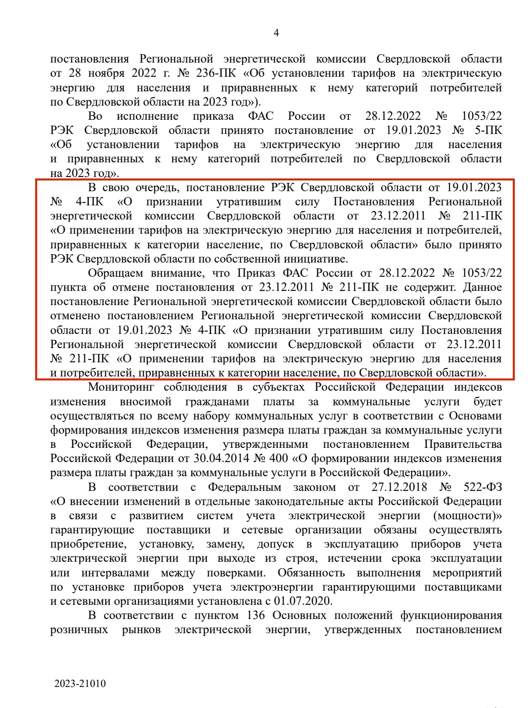 «Обращаем внимание, что Приказ ФАС России от 28.12.2022 № 1053/22 пункта об отмене постановления от 23.12.2011 № 211-ПК не содержит. Данное постановление Региональной энергетической комиссии Свердловской области было отменено постановлением Региональной энергетической комиссии Свердловской области от 19.01.2023 № 4-ПК «О признании утратившим силу Постановления Региональной энергетической комиссии Свердловской области от 23.12.2011 № 211-ПК «О применении тарифов на электрическую энергию для населения и потребителей, приравненных к категории население, по Свердловской области», — говорится в ответе ФАС.