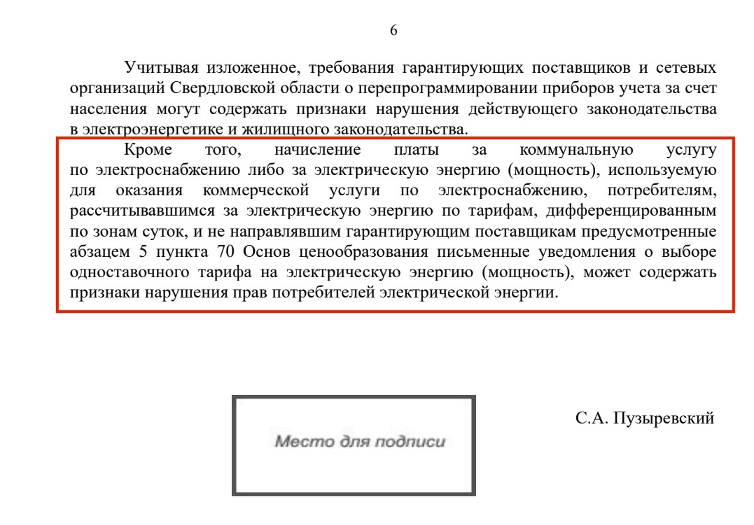 «Кроме того, начисление платы за коммунальную услугу по электроснабжению либо за электрическую энергию (мощность), используемую для оказания коммерческой услуги по электроснабжению, потребителям рассчитывавшимся за электрическую энергию по тарифам, дифференцированным по зонам суток, и не направлявшим гарантирующим поставщикам предусмотренные абзацем 5 пункта 70 Основ ценообразования письменные уведомления о выборе одноставочного тарифа на электрическую энергию (мощность), может содержать признаки нарушения прав потребителей электрической энергии», — говорится в документе.