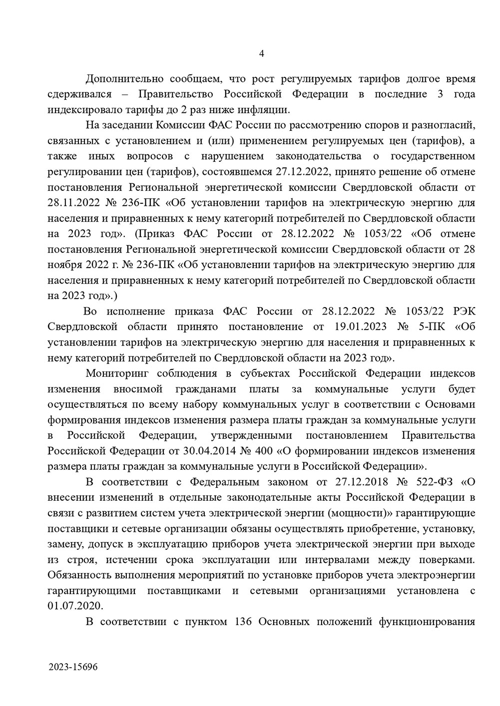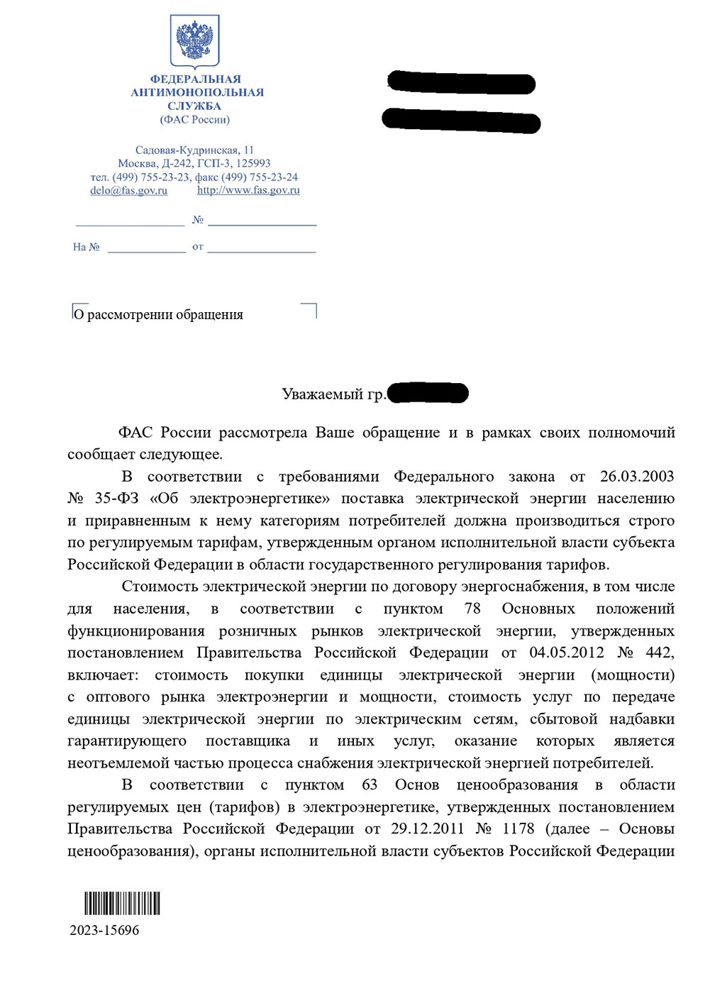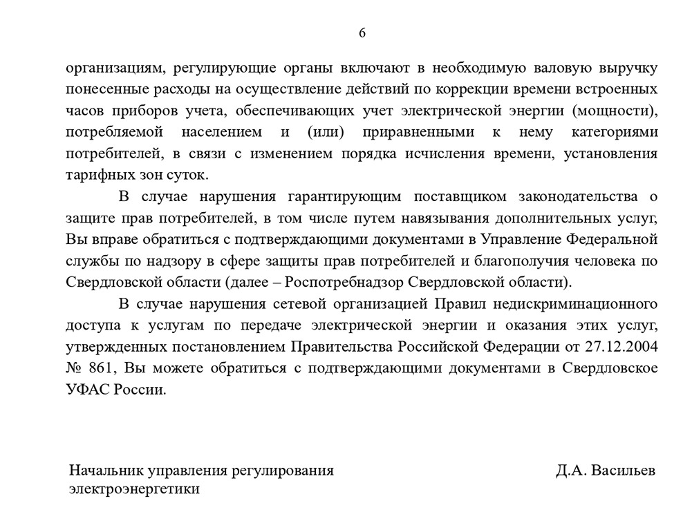 В документе на шесть страниц за подписью начальника управления регулирования электроэнергетики ФАС тагильчанин не нашёл ответа ни на один вопрос. Из него лишь следует, что решение Региональной энергетической комиссии Свердловской области об отмене круглосуточного действия ночного тарифа в выходные и праздничные дни действительно принято по указанию антимонопольщиков.