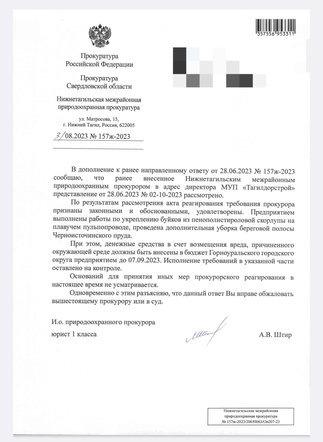 «Предприятием выполнены работы по укреплению буйков из пенополистироловой скорлупы на плавучем пульпопроводе, проведена дополнительная уборка береговой полосы Черносточинского пруда. При этом, денежные средства в счет возмещения вреда, причиненного окружающей среде должны быть внесены в бюджет Горноуральского городского округа предприятием до 07.09.2023. Исполнение требований в указанной части оставлено на контроле», — говорится в ответе Нижнетагильской межрайонной природоохранной прокуратуры, который опубликовал местный житель Рамиль Хакимов.