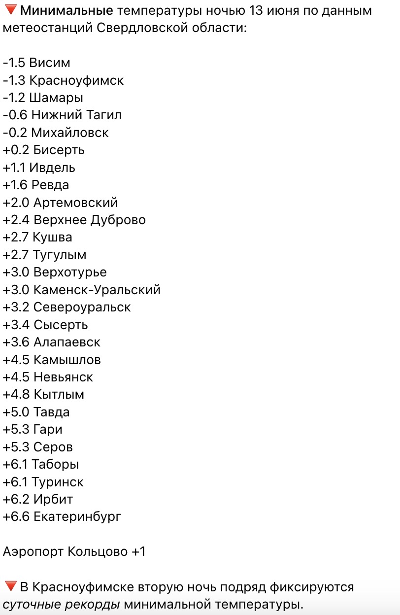 «Минимальные температуры ночью 13 июня по данным метеостанций Свердловской области: -1.5 градуса в Висиме, -1.3 в Красноуфимске, -1.2 в Шамарах, -0.6 в Нижнем Тагиле и -0.2 в Михайловске», — рассказал Пулин.