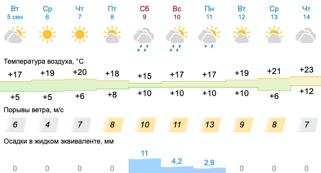 Что касается погоды на ближайшую неделю, то существенных изменений не ожидается: днём тепло, а ночью не исключаются слабые заморозки в низинах. Температура 6-8 сентября в дневные часы будет колебаться в диапазоне +16...+21, а в дальнейшем погоду определит циклон, который опустится с европейского севера России на Урал. С 8 и вплоть до 11 сентября вероятны дожди.