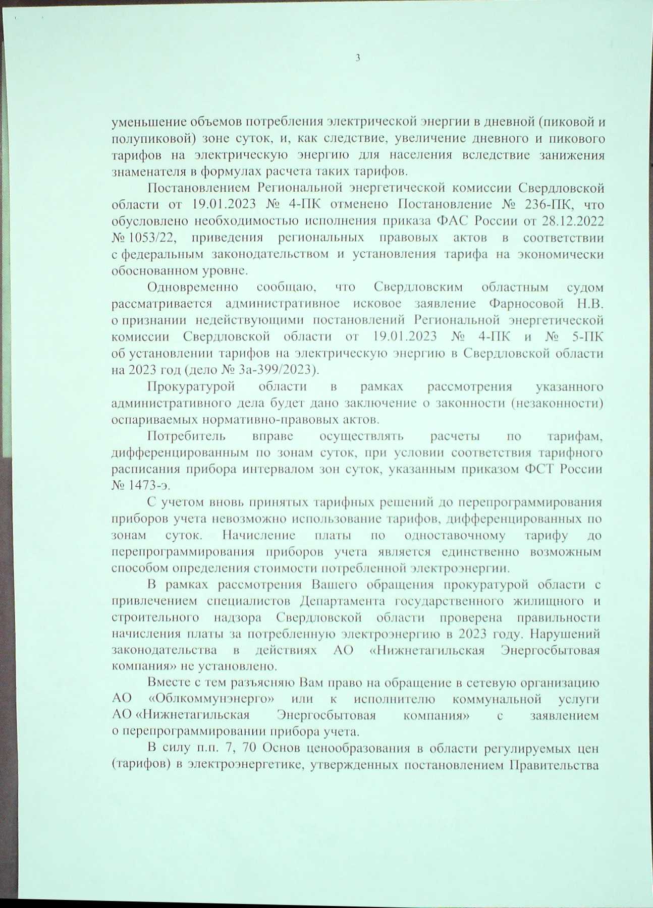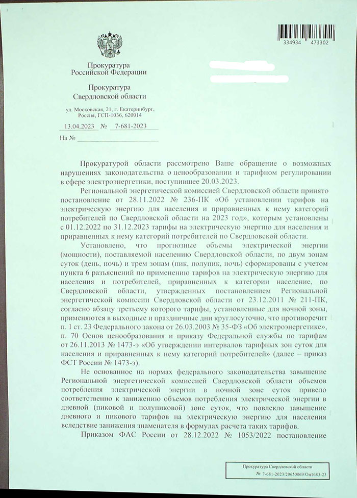 Изначально тагильчанин просил прокуратуру Свердловской области проверить рост платежа за электроэнергию на 40% разом, а также перевод на единый тариф задним числом с 1 января. Третьим доводом он указывал, что не может вернуться на схему «день-ночь», так как в сбытовой компании не принимали (на тот момент) заявки на перепрограммирование счётчиков. В марте он получил ответ, но не от прокуратуры, а от Региональной энергетической комиссии (документ мы публиковали здесь) — именно она и отменила льготу выходного дня, вследствие чего всех потребителей перевели на единый тариф.