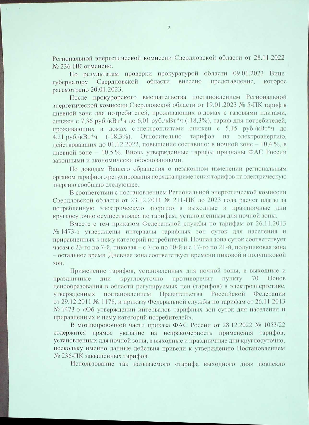Льготу выходного дня отменили, так как при изначальных расчётах (первое постановление РЭК приняла в ноябре, его отменила ФАС) получилось уменьшение объёмов потребления в пиковой дневной зоне, и, как следствие, увеличение этого тарифа вследствие занижения знаменателя в формулах расчётах, говорится в ответе надзорного ведомства. Там также упомянули административный иск свердловчанки, которая пытается оспорить решения РЭК о повышении тарифов и отмене льготы выходного дня в областном суде — в рамках этого дела в прокуратуре пообещали дать правовую оценку скандальным правовым актам.