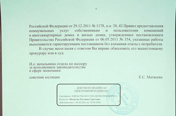 «Начисление платы по одноставочному тарифу до перепрограммирования приборов учёта является единственно возможным способом определения стоимости потреблённой энергии. В рамках рассмотрения Вашего обращения прокуратурой области с привлечением специалистов Департамента госжилконтроля Свердловской области проведена проверка правильности начисления платы за потреблённую электроэнергию в 2023 году. Нарушений законодательства не установлено», — указали в прокуратуре.