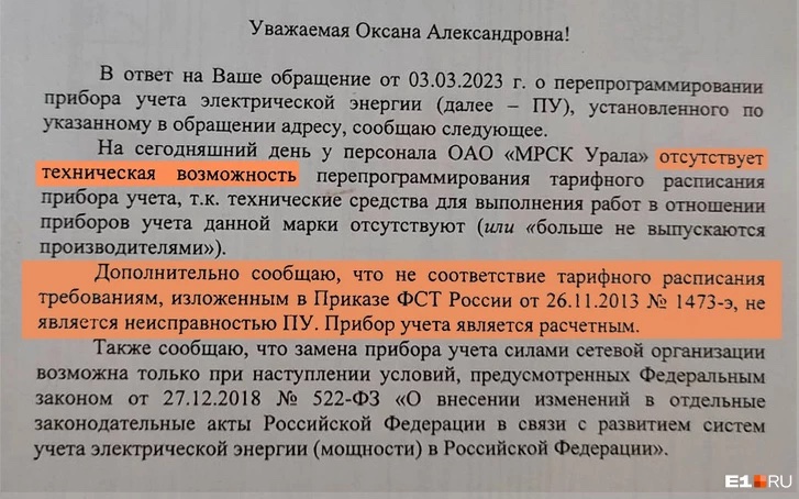 Жительница частного дома в январе получила счёт за электричество в размере 9 тыс. рублей, вместо привычных 5 тыс., поэтому она обратилась в компанию «МРСК Урала» с просьбой обновить прибор учёта. Её было отказано в процедуре из-за «отсутствия технической возможности перепрограммирования тарифного расписания прибора учета». В полученном ответе утверждается, что устройства для работы со счетчиком отсутствуют или больше не выпускаются, сообщает e1.ru.