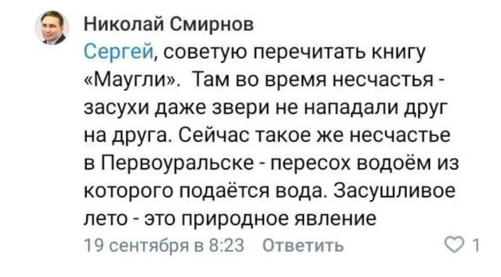 «Советую перечитать книгу «Маугли». Там во время несчастья — засухи — даже звери не нападали друг на друга. Сейчас такое же несчастье в Первоуральске: пересох водоем, из которого подается вода. Засушливое лето — это природное явление», — ответил Смирнов жителям во Вконтакте.