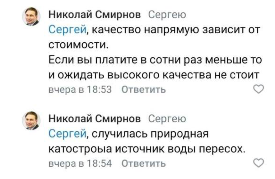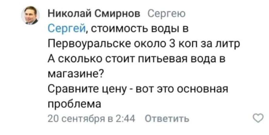 «Стоимость воды в Первоуральске около 3 коп. за литр. А сколько стоит питьевая вода в магазине? Сравните цену — вот это основная проблема», — написал министр, позже добавив, что «качество напрямую зависит от стоимости, если вы платите в сотни раз меньше, то и ожидать высокого качества не стоит».