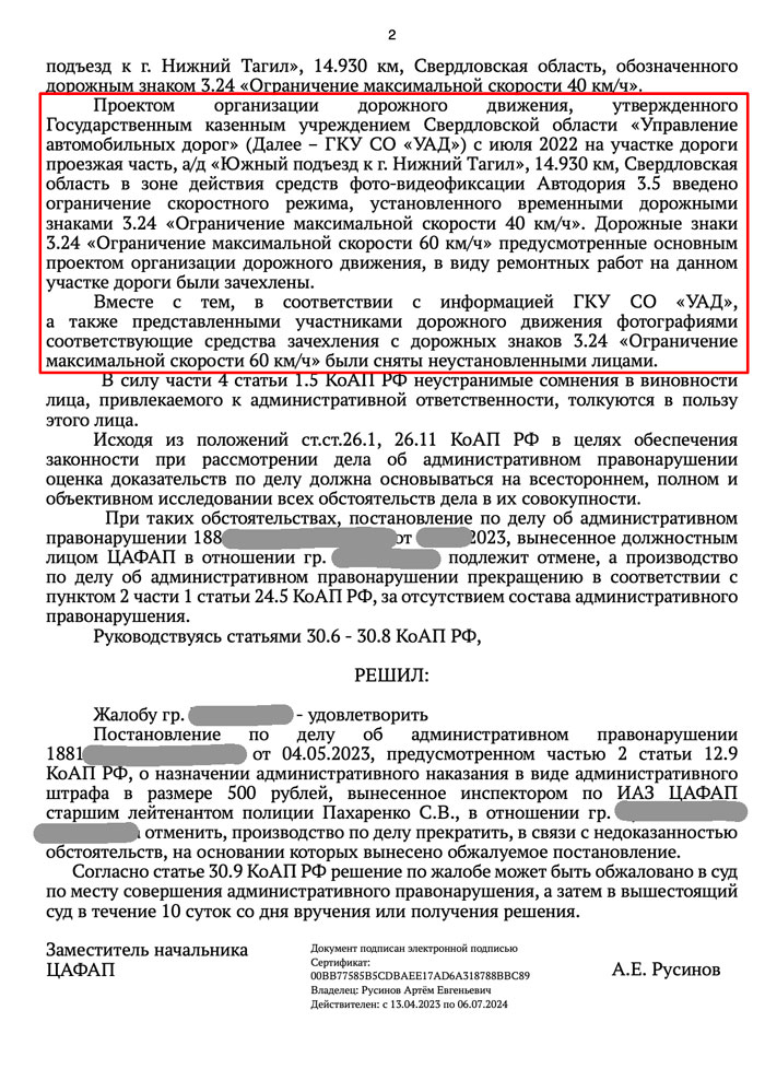 В полученных ответах за подписью заместителя начальника Центра автоматизированной фиксации административных правонарушений (ЦАФАП) Госавтоинспекции по Свердловской области говорится, что камера действительно должна работать по временному знаку «Ограничение максимальной скорости 40 км/ч», тогда как знак на 60 км/ч должен был быть закрыт, но «средства зачехления сняли неустановленные лица».