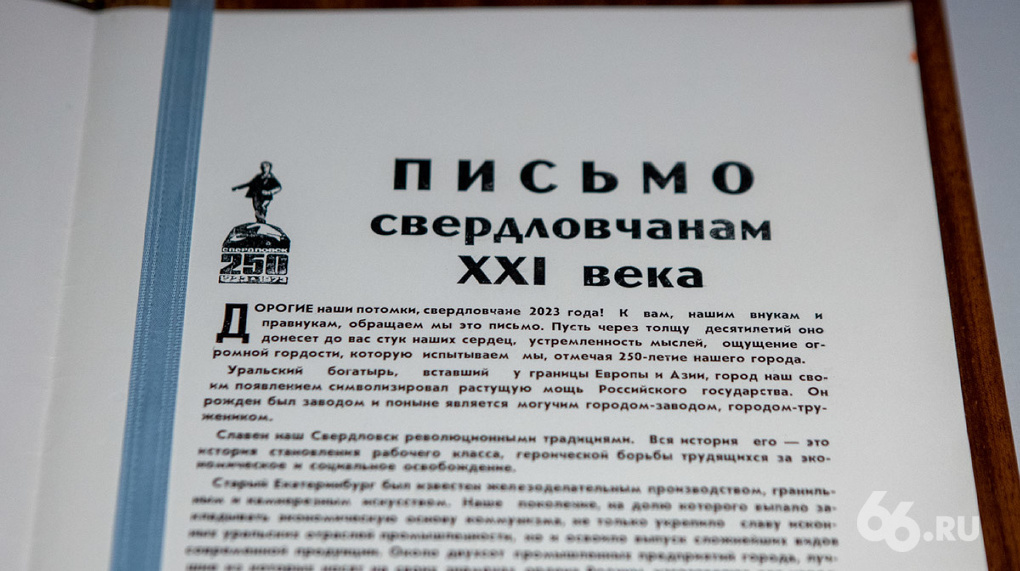 «Будущее видится нам еще более прекрасным. Завидуем вам, свердловчанам 2023 года, приумножившим революционные и трудовые традиции города. Завидуем и верим – ваши усилия, дерзания и вдохновение смогут претворить в жизнь то, чего не успели сделать мы, о чем мы только мечтали. Мы уверены, что вы будете достойными продолжателями дела великого Ленина, дела Коммунистической партии».