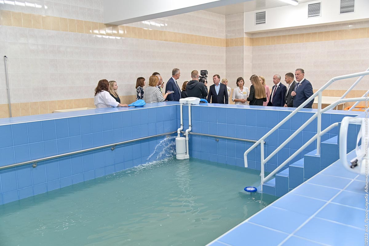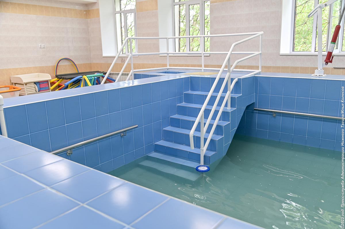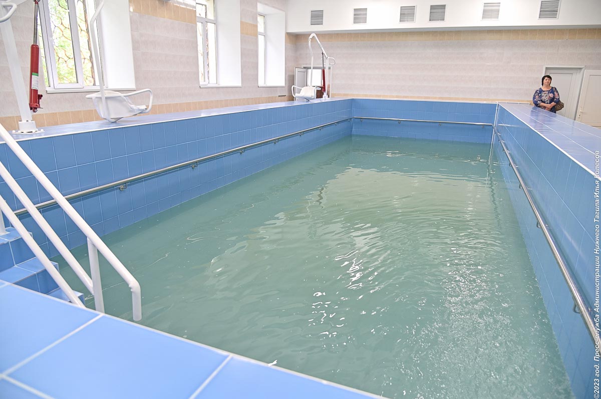 Самым важным этапом ремонта стало долгожданное восстановление бассейна, который не функционировал из-за протечки крыши на протяжении нескольких лет. В водолечебнице заменили кровлю, оконные блоки, радиаторы отопления. В большой и малой чашах бассейна выполнили гидроизоляцию и обновили покрытие, смонтировали новую систему подачи, фильтрации, обеззараживания и нагрева воды.