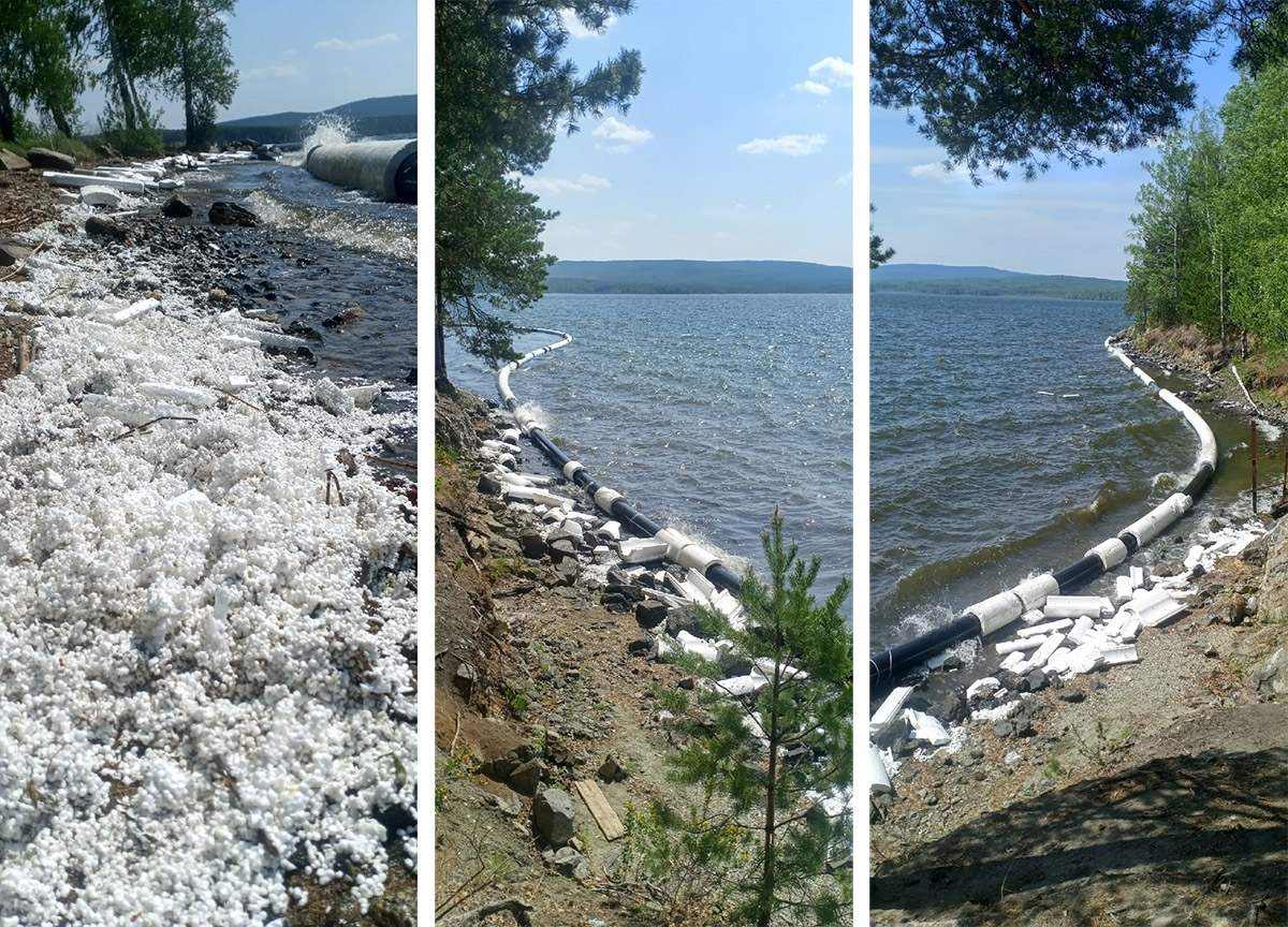 Напомним, инцидент произошёл в мае. От ветра трубы, по которым качают донные отложения, прибило к каменистому берегу и пенопласт, используемый в качестве поплавка, разлетелся на мелкие части. Большую часть крошки удалось собрать.