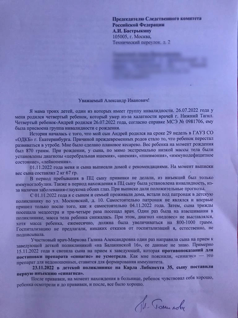 «1 января следователь вызвал нас для дачи объяснений, мы всё рассказали. Но дело по смерти ребенка возбуждать не захотели. После этого мы написали заявление Бастрыкину. Очень много вопросов: откуда у ребенка синяки после реанимации, почему в свидетельстве о смерти указан не тот адрес, где результаты гистологического исследования?», — рассказала представитель семьи.