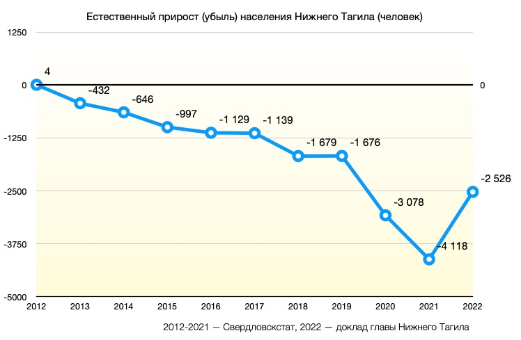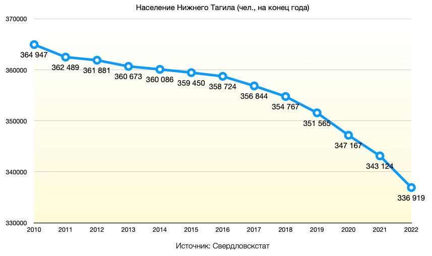За год население Нижнего Тагила сократилось на более чем 6 тыс. человек (максимальное значение за последнее десятилетие) и достигло отметки в 338,8 тыс. человек, указано в 40-страничном докладе Владислава Пинаева (дана среднегодовая оценка, на 1 января 2023 г. численность снизилась до 336,9 тыс. человек). Родилось в городе почти в два раза меньше, чем умерло (5,2 тыс.), а сама рождаемость (2,7 тыс. человек) упала до минимального значения за современную историю. Помимо естественной убыли зафиксирована миграционная убыль — уехали из города на 1,4 тыс. человек больше, чем приехали.
